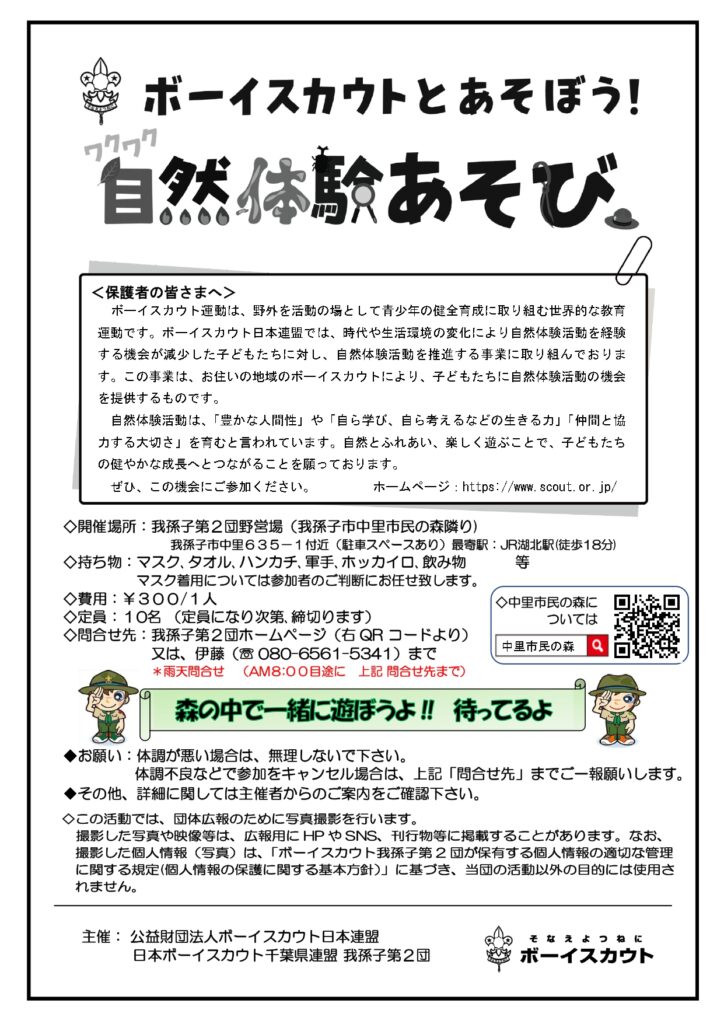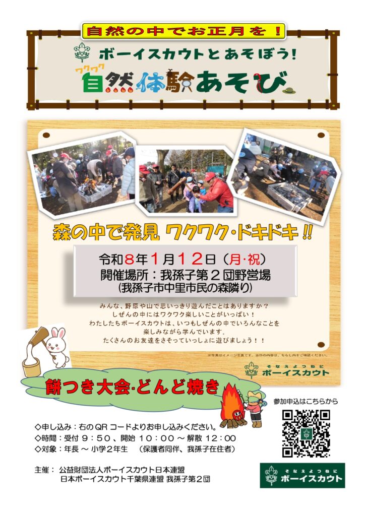 2026年1月12日(月・祝)「ボーイスカウト我孫子第2団野営場(中里市民の森隣り)」にて、「もちつき大会、どんと焼き」を開催します。申込みは12月6日(土)10時から開始となります。